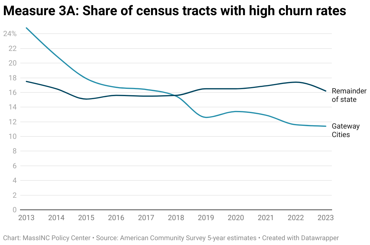 Across Gateway Cities, the share of census tracts where more than one-fifth of residents had moved within the past 12 months has fallen steadily, from 25 percent in 2013 to 10 percent in 2023. Similarly, the number of Gateway Cities with at least one of these high-churn neighborhoods fell from 24 to 17.