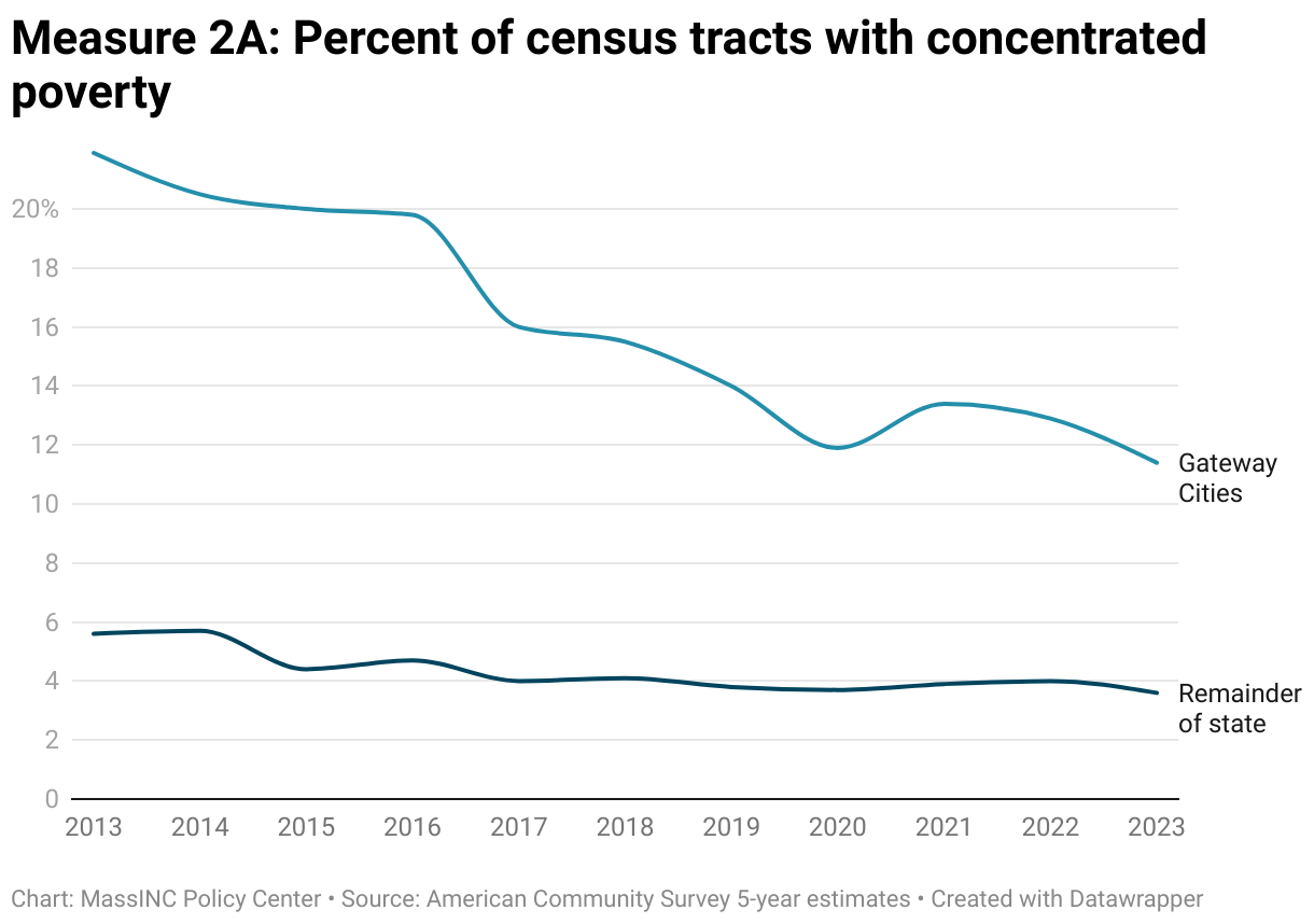 From 2013 to 2023, the share of census tracts in Gateway Cities with concentrated poverty fell from 22 percent to 11 percent—a historic improvement that cut the prevalence of concentrated poverty in half. Yet even with this progress, Gateway Cities continue to face much higher levels of concentrated disadvantage than the rest of Massachusetts, where less than 4 percent of tracts were above the 30-percent poverty threshold in 2023. This stark difference underscores how residential segregation by income remains a defining challenge for Gateway Cities.