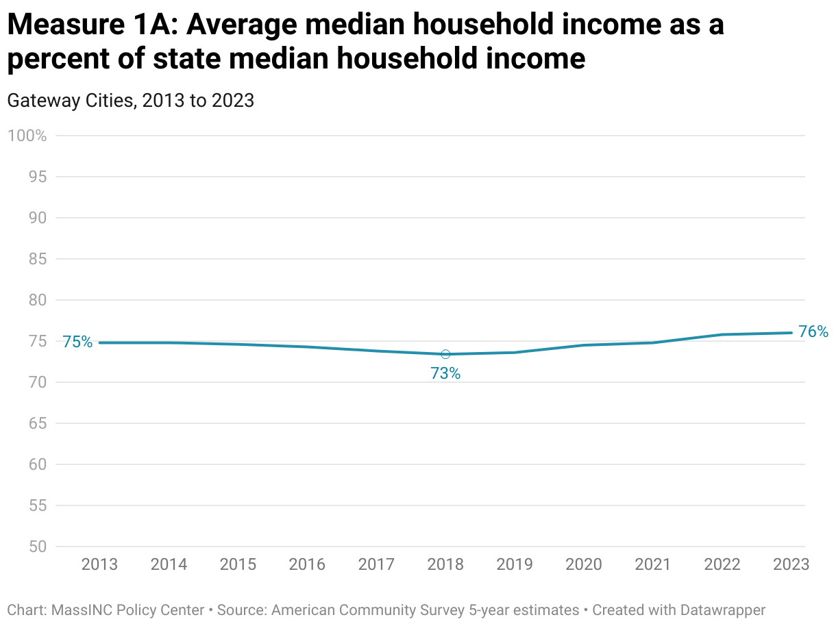 From 2013 to 2018, income fell relative to the state average by 1.4 percentage points, but Gateway City median household incomes rebounded relative to the state from 2018 to 2023, gaining back 2.6 percentage points. The difference between average Gateway City median household income and state median household income is now at a 10-year low.