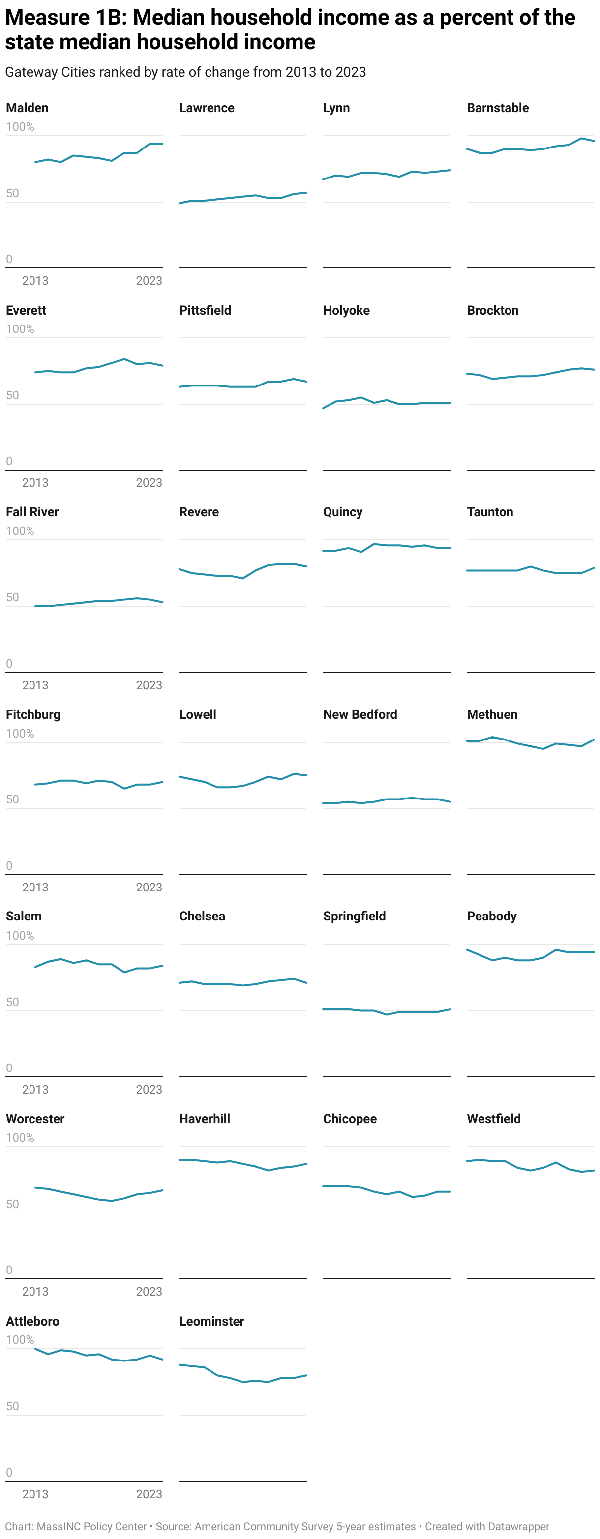 These estimates come from the US Census Bureau’s American Community Survey (ACS). ACS produces both 1-year and 5-year estimates, but 1-year data are only available for geographies with populations above 65,000. Since many Gateway Cities are below this threshold, 5-year estimates must be used for this analysis. Five-year estimates average data collected over multiple years. This smooths out short-term changes and makes these estimates better suited for tracking longer-term patterns.