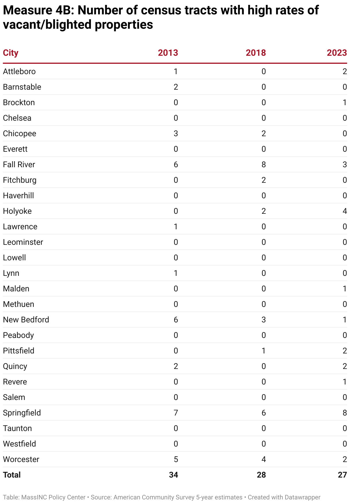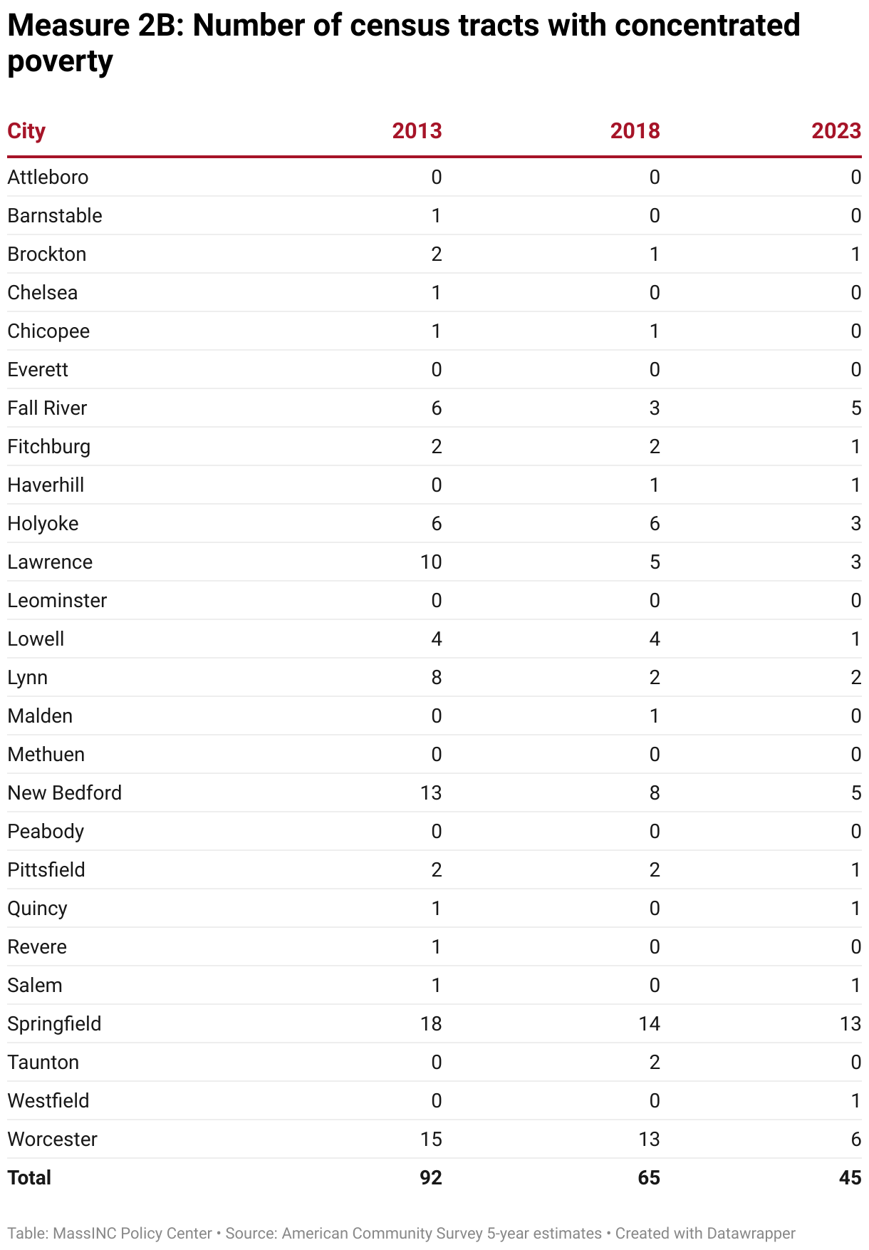 Springfield, Worcester, Fall River, and New Bedford each continue to have five or more high-poverty neighborhoods. In Springfield, about one in three residents live in neighborhoods with concentrated poverty; in Holyoke and Fall River, it is about one in five. Worcester, New Bedford, Lawrence, and Lynn distinguished themselves by achieving the greatest reductions in the number of high-poverty neighborhoods between 2013 and 2023.
