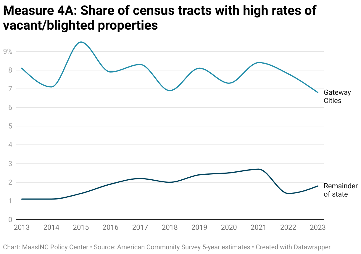 As whole, Gateway Cities are stable or improving across a range of neighborhood condition metrics. On average, Gateway City median household incomes are rising slightly relative to the state. The share of Gateway City neighborhoods with concentrated poverty fell from 22 percent in 2013 to 11 percent in 2023. And the share of Gateway City census tracts with clusters of vacant and blighted housing fell from 8.1 percent in 2013 to 6.8 percent in 2023.