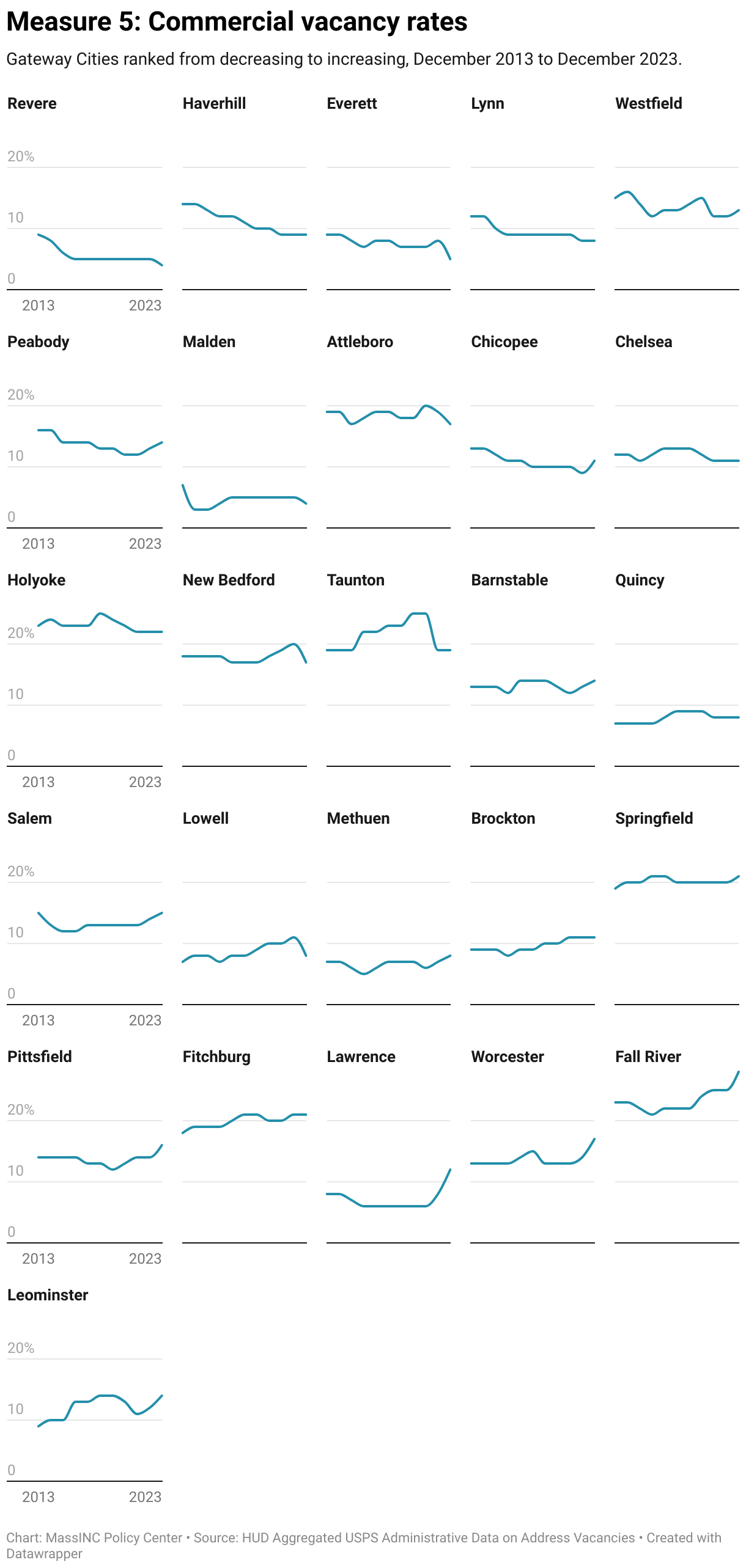 The Gateway City average was essentially unchanged from 2013 to 2023, remaining at around 13 percent. However, this average hides a great deal of variation in commercial vacancy rates across Gateway Cities. In 2023, 16 of the 26 Gateway Cities had commercial vacancy rates above 10 percent, and 10 cities had rates above 15 percent. Meanwhile, commercial vacancy rates were very low and falling in the Gateway Cities closest to Boston (Everett, Malden, and Revere).