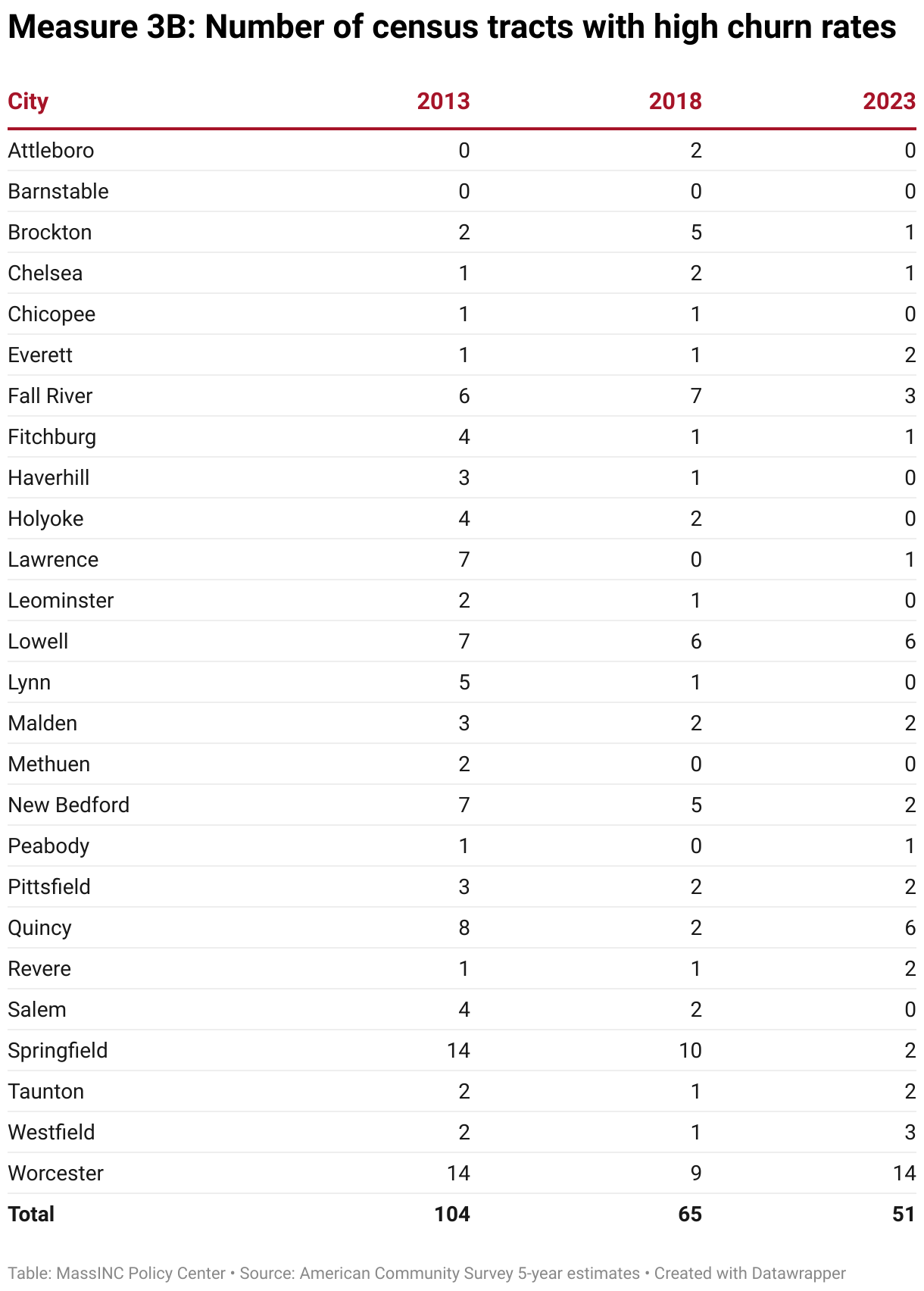 In several Gateway Cities, the number of high-churn neighborhoods fell to zero, including Chicopee, Haverhill, Leominster, Lynn, and Salem. Holyoke, Salem, Lawrence, and Springfield have seen the most dramatic reduction. In these cities, more than one-third of census tracts had high churn rates in 2013, and now just 4 percent do.