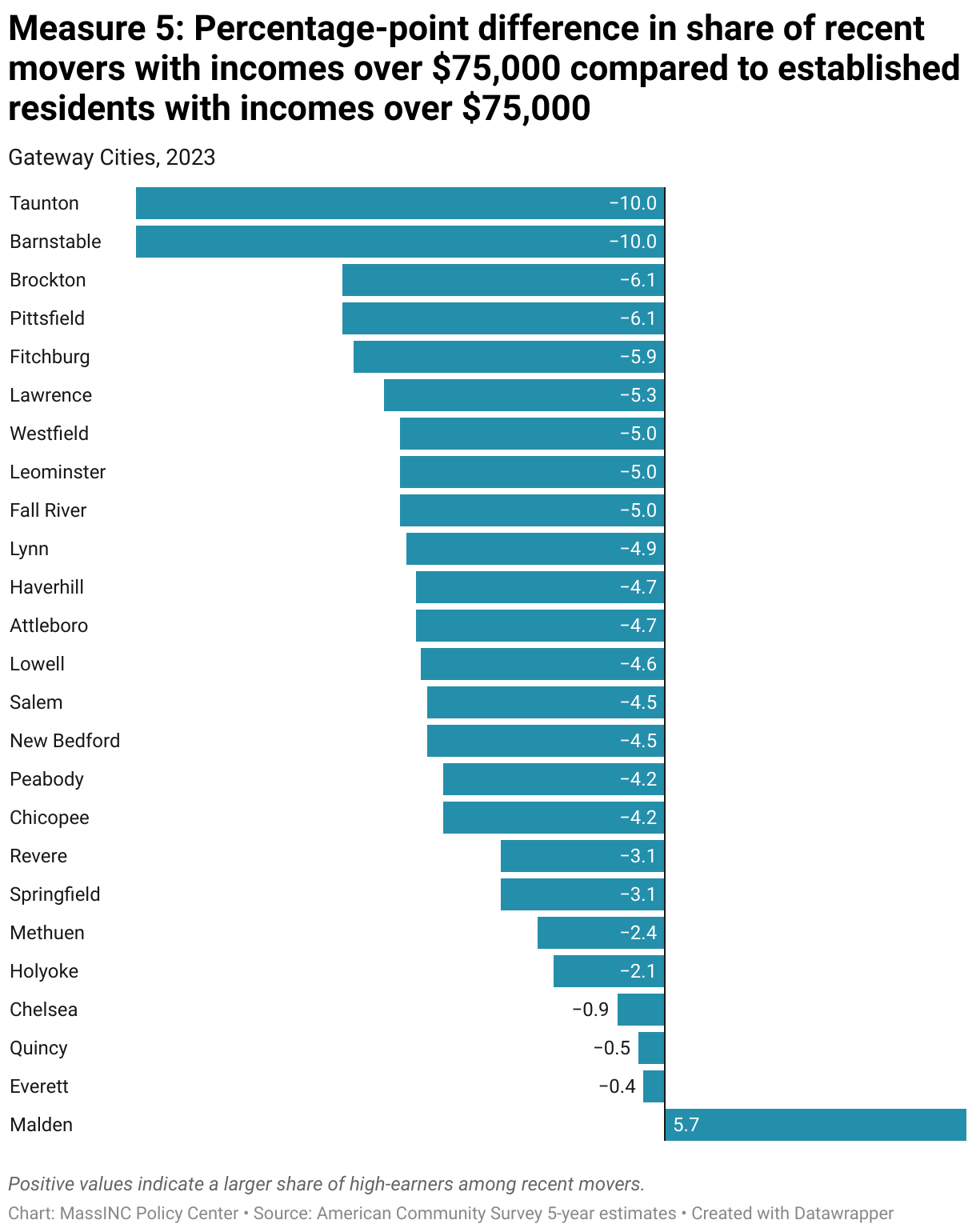 This measure compares the share of households who moved into each city in recent years with income above $75,000 to the share of incumbent households with income over this threshold. In the chart, positive values mean recent newcomers are more likely to be higher-income than more established residents.