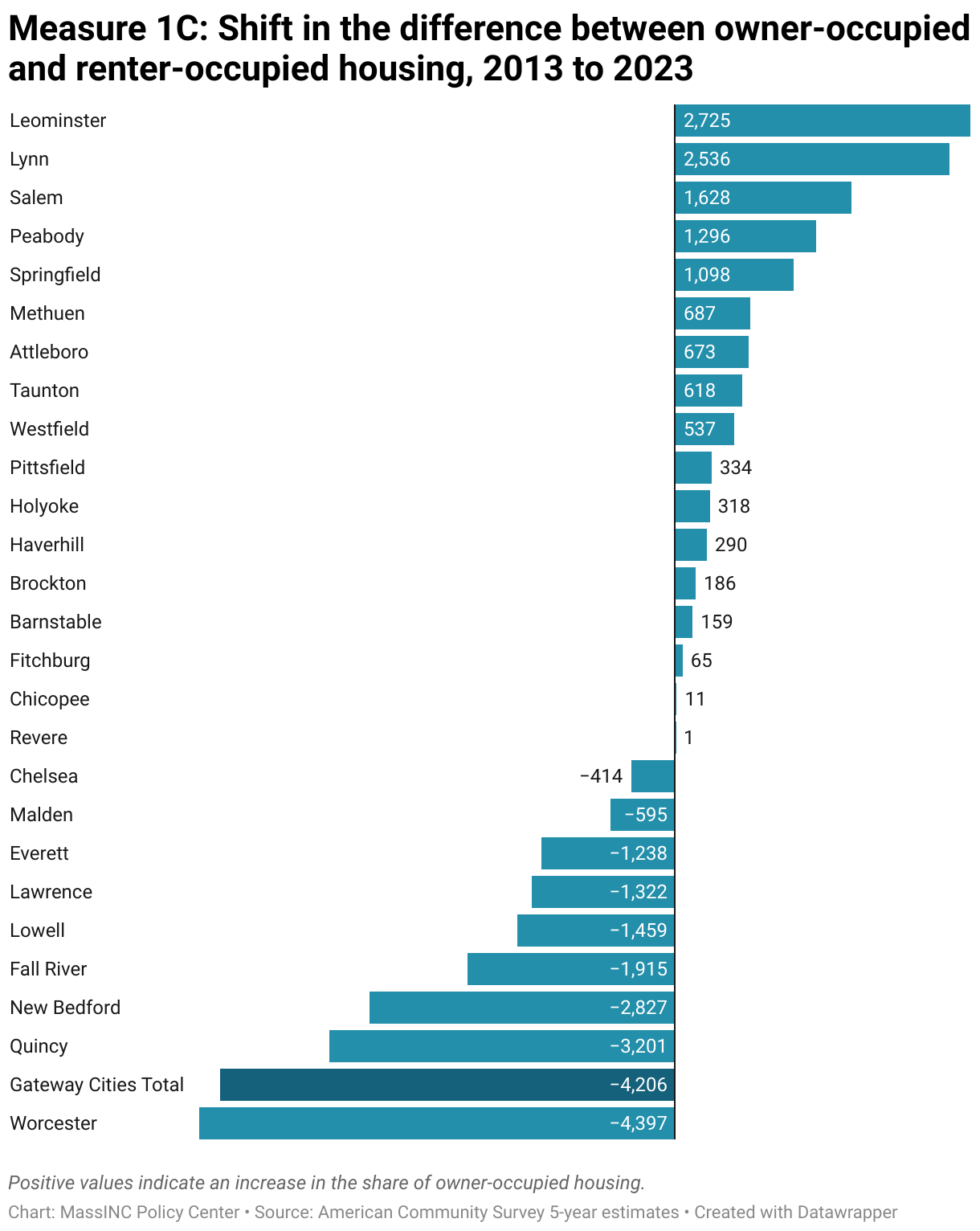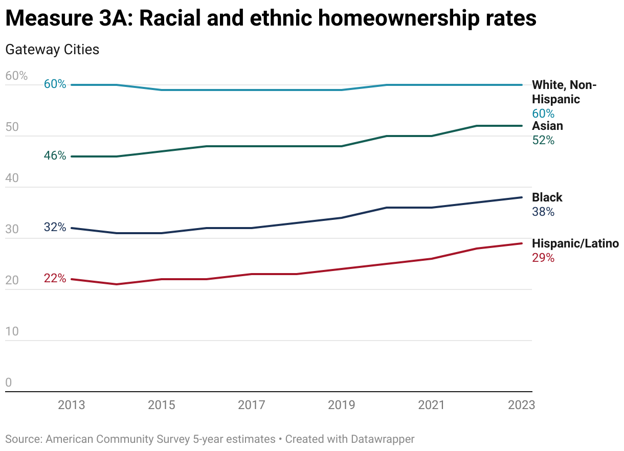 Homeownership and renting are not just housing choices; they’re different positions in a local housing market. In places where prices are appreciating, the gains tend to accrue to owners, while renters absorb higher housing costs and face greater displacement risk. Since households of color in Gateway Cities are more likely to rent, a persistent tenure divide can reinforce class differences by race and ethnicity, even as neighborhoods revitalize. Tracking the homeownership rate gap over time provides a clear test of whether revitalization is narrowing disparities in access to homeownership.