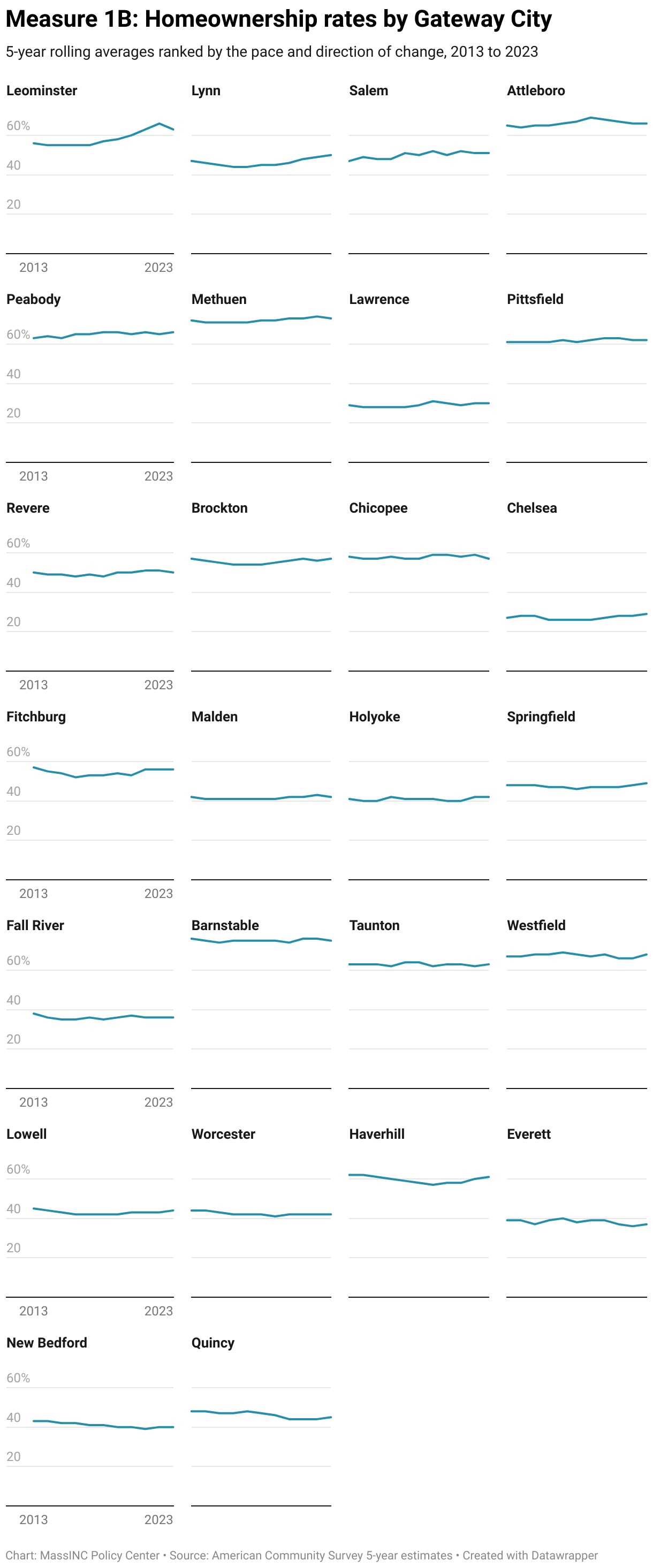 These measures track the percent of households that own their own home (regardless of mortgage status) for the Gateway Cities as a group, Gateway City suburbs, and the Massachusetts average. Measure 1B provides homeownership rates over the past 10 years for each Gateway City. And Measure 1C shows how the balance of total housing units has shifted between rental and homeownership during this period.
