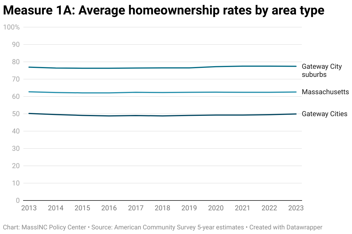 Over the past 10 years, the homeownership rate for Massachusetts residents who live in Gateway Cities has hovered around 50 percent. Likewise, the homeownership rate for Gateway City suburbs has been very stable at just under 80 percent of households, and the statewide rate has also been flat at around two-thirds of households (63 percent).