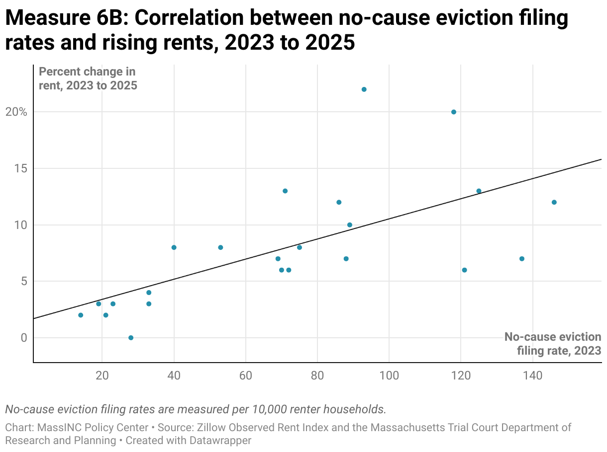 Across Gateway Cities, there is a clear relationship between rising rents and the prevalence of no-cause eviction filings. In communities where rents have surged the fastest, filings are consistently among the highest. Taunton and Brockton, which saw rents jump more than 20 percent over two years, both reported over 90 no-cause filings per 10,000 residents in 2024. Similarly, Fall River and New Bedford had double-digit rent growth and very high filing volumes. By contrast, Gateway Cities near Boston with already high rent levels—such as Quincy, Malden, Chelsea, and Everett—have had much lower filing rates alongside slower rent growth. Together, these patterns suggest that landlords in the state’s lowest-cost Gateway Cities believe that they can get higher rents given how tight housing markets are throughout the state.