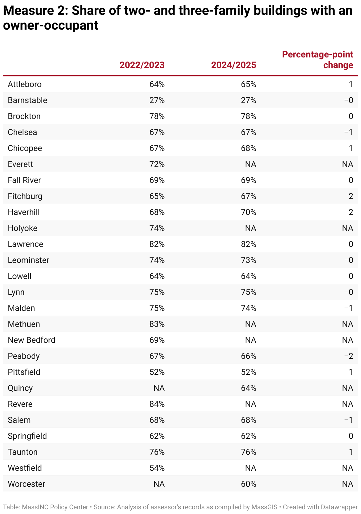 Owner-occupancy in duplexes and three-families is stable at 67 percent of these structures from the 2022–2023 sample to the 2024–2025 sample. Most Gateway Cities had owner-occupancy rates close to the average with a few exceptions. Most notably, Barnstable and Pittsfield are well below the average and Lawrence and Brockton are well above it, each with a difference from the average in excess of 10 percentage points.