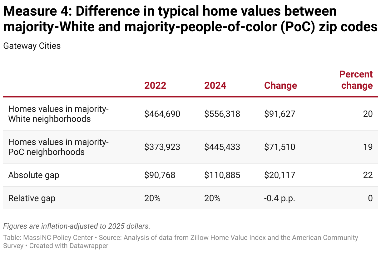 Between 2022 and 2024, typical inflation-adjusted home values in majority-White Gateway City neighborhoods rose from about $465,000 to $556,000, a 20-percent increase. At the same time, home prices increased from $374,000 to $445,000 in Gateway City neighborhoods where people of color make up a majority of residents. While this 19-percent increase was on par with majority-White neighborhoods, home values in communities of color remain about 20 percent lower. Roughly equal percentage gains on unequal baselines mean those living in majority-White neighborhoods saw a larger net increase in equity, furthering the racial wealth gap.