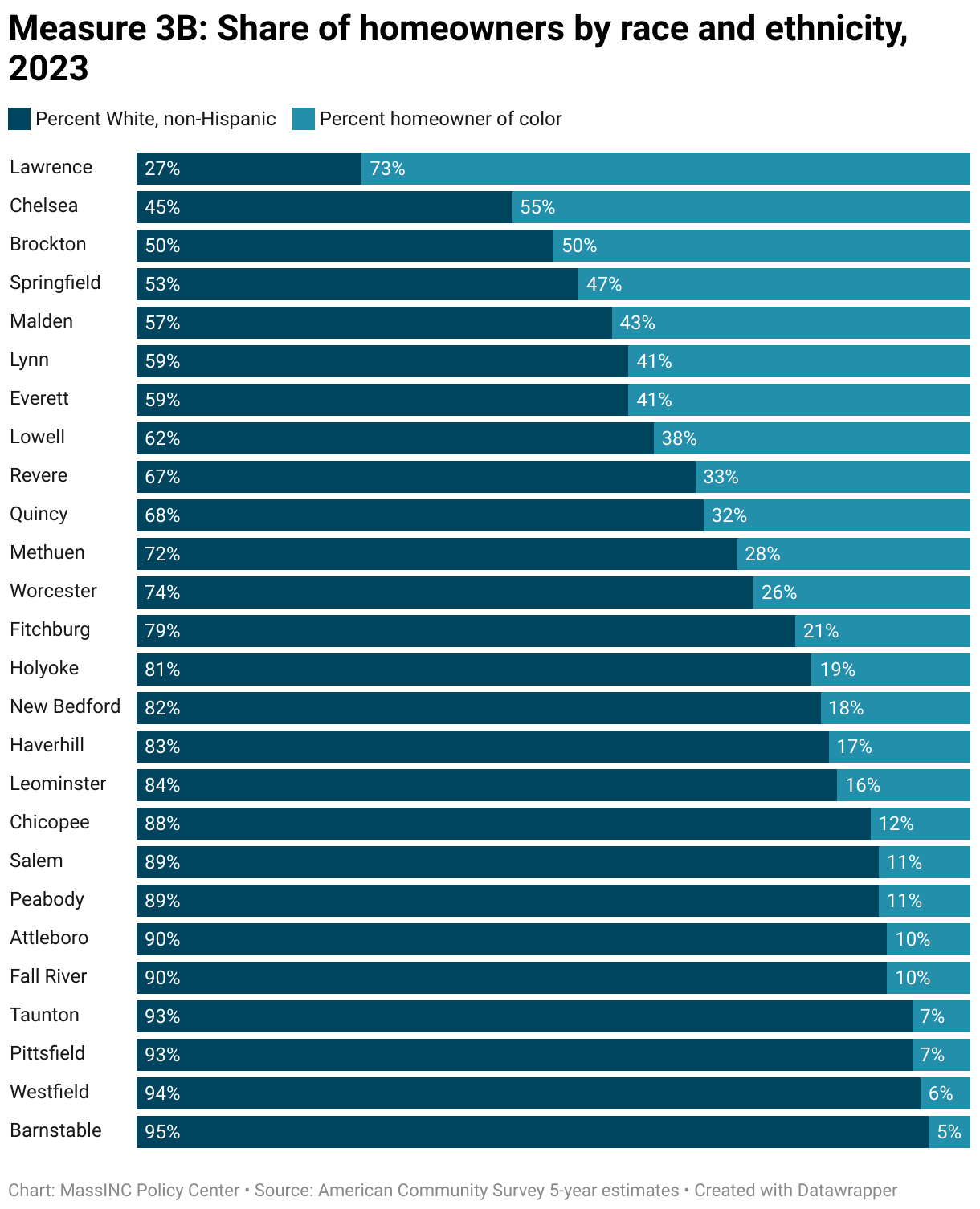 These indicators track changes in homeownership within communities by race and ethnicity. The Measure 3A indicator reports the percentage-point gap in homeownership rates between White householders and Black, Hispanic, and Asian householders. Negative values mean White householders own at higher rates; zero indicates parity. Measure 3B shows the composition of homeowners in each city by race and ethnicity as of 2023.