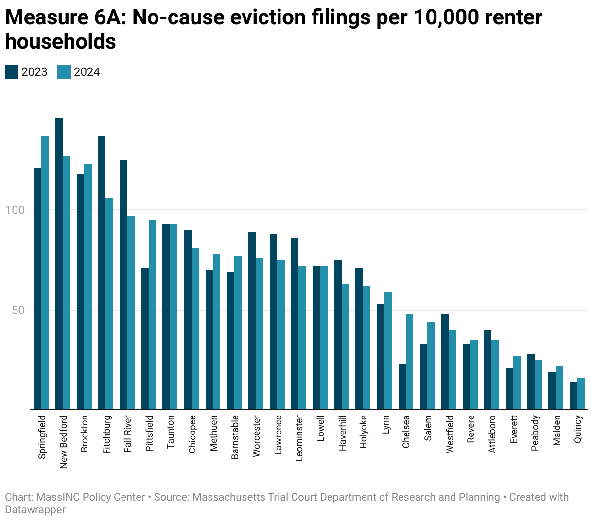 This indicator tracks the number of no-cause eviction filings per 10,000 residents in Gateway Cities. A no-cause eviction occurs when a landlord seeks to remove a tenant without alleging nonpayment of rent, violation of lease terms, or other “just cause.” In Massachusetts, this is typically done through a notice to quit followed by a court filing, and it can happen even when tenants are current on rent and following their lease. Because the filing does not require a specific reason, it highlights the degree of housing insecurity tenants face purely at a landlord’s discretion.