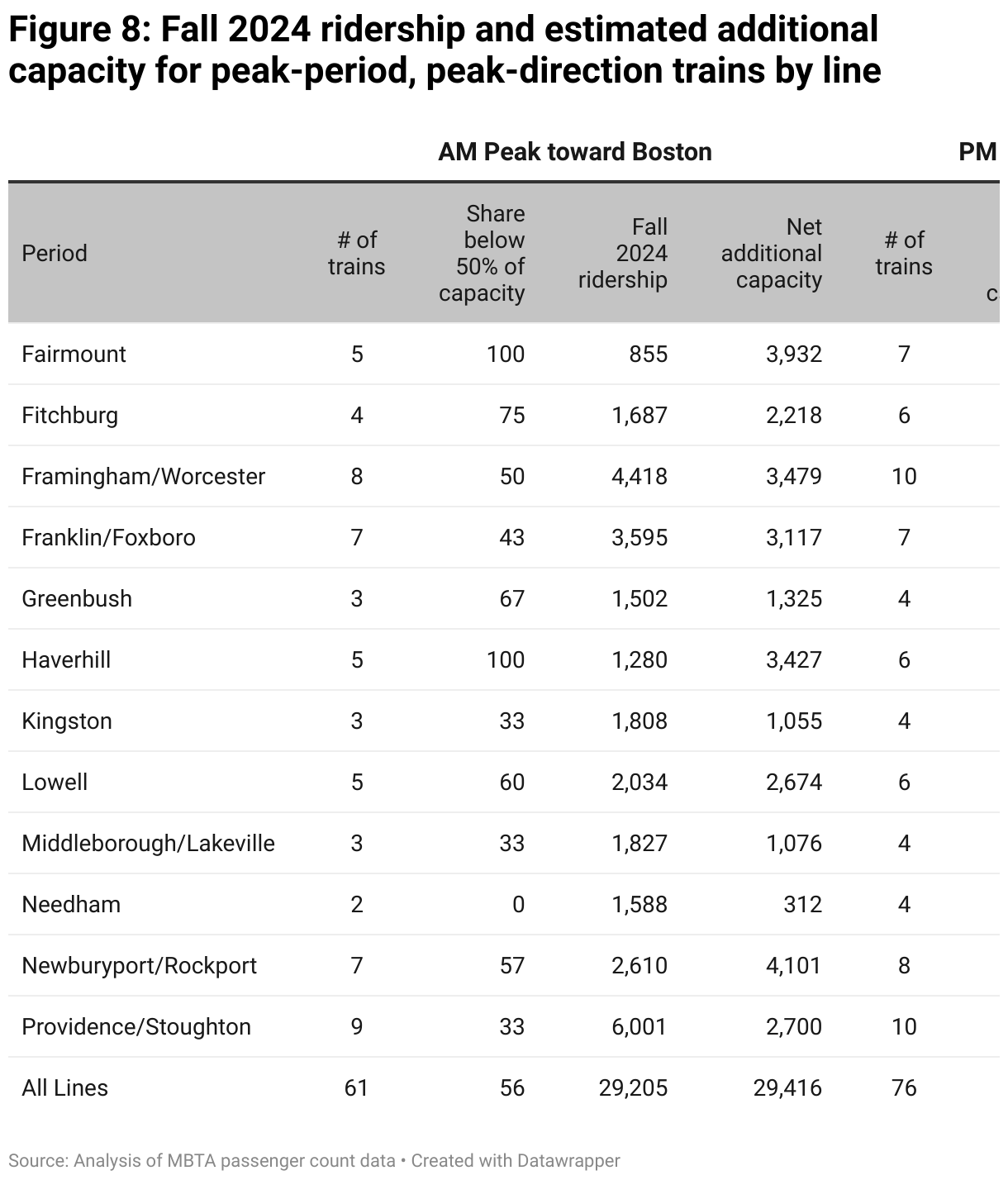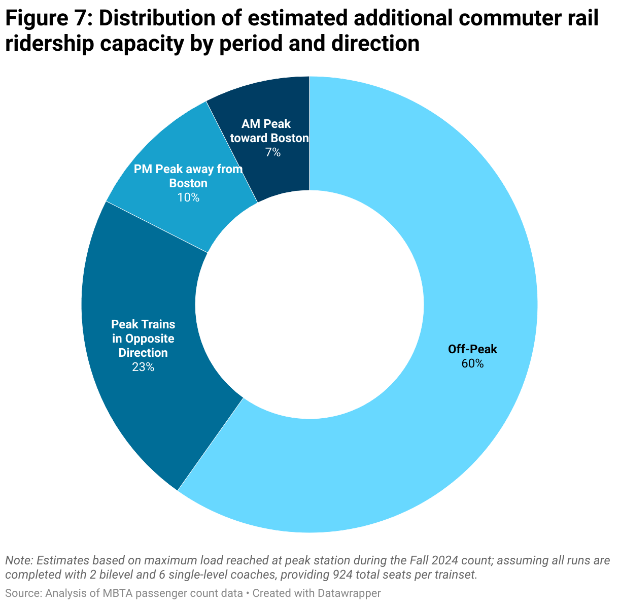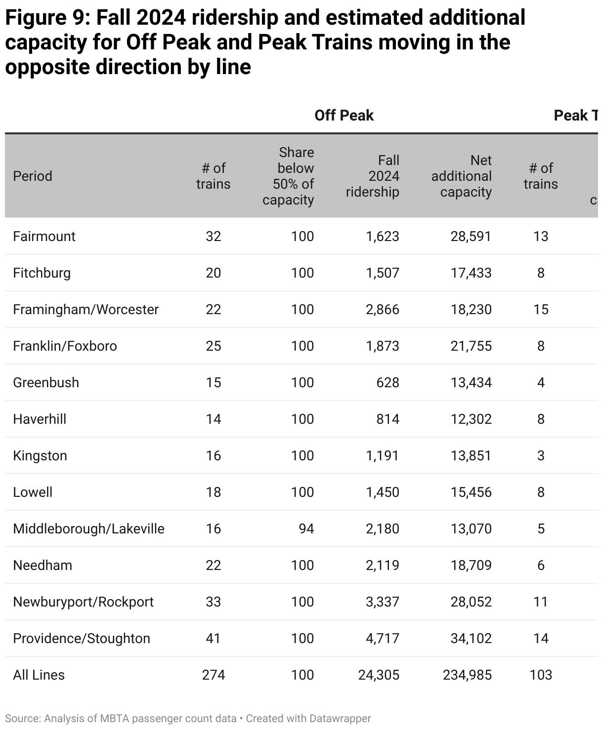 With the fall 2024 schedule, trains moving outbound from Boston during the AM peak could carry 38,000 more riders. And afternoon peak trains moving inbound could accommodate over 50,000 additional passengers. However, the largest source of additional capacity is off-peak trains moving in either direction. Together, these 274 trips could move 235,000 more riders, if seats were fully occupied.