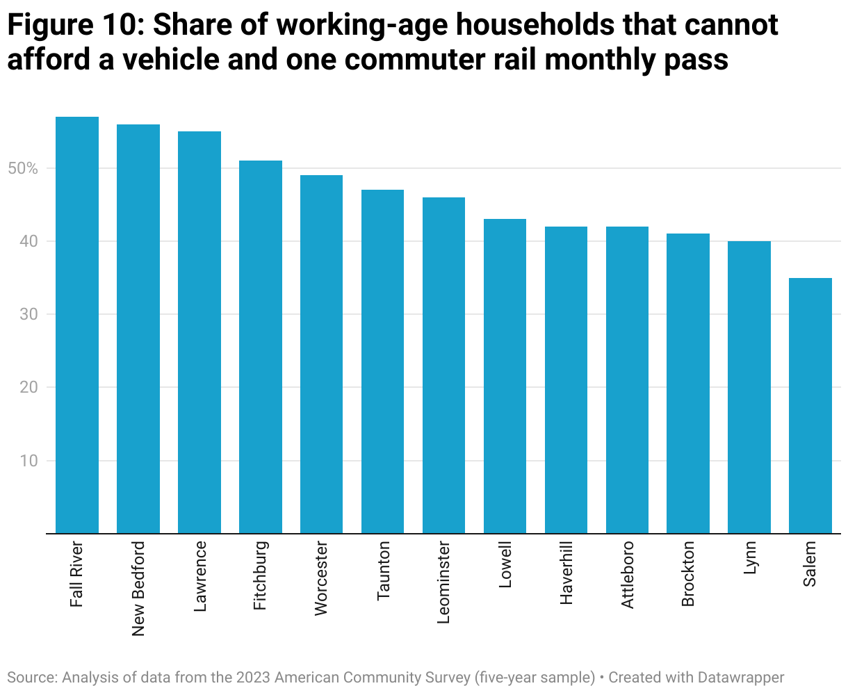 However, expending 15 percent of income on a rail pass is not practical for many residents living in these communities. While there have been considerable improvements to Regional Transit Authority bus schedules, Gateway Cities are not nearly as well-served by local public transit as those living in the Boston core. As such, most households still require at least one vehicle to meet basic needs. The combined cost of vehicle ownership and a monthly pass is well out of reach for more than half of the residents of Fall River and New Bedford. In all of the other Gateway Cities, one vehicle and a monthly pass is cost-prohibitive for one-third or more of residents (Figure 10).16