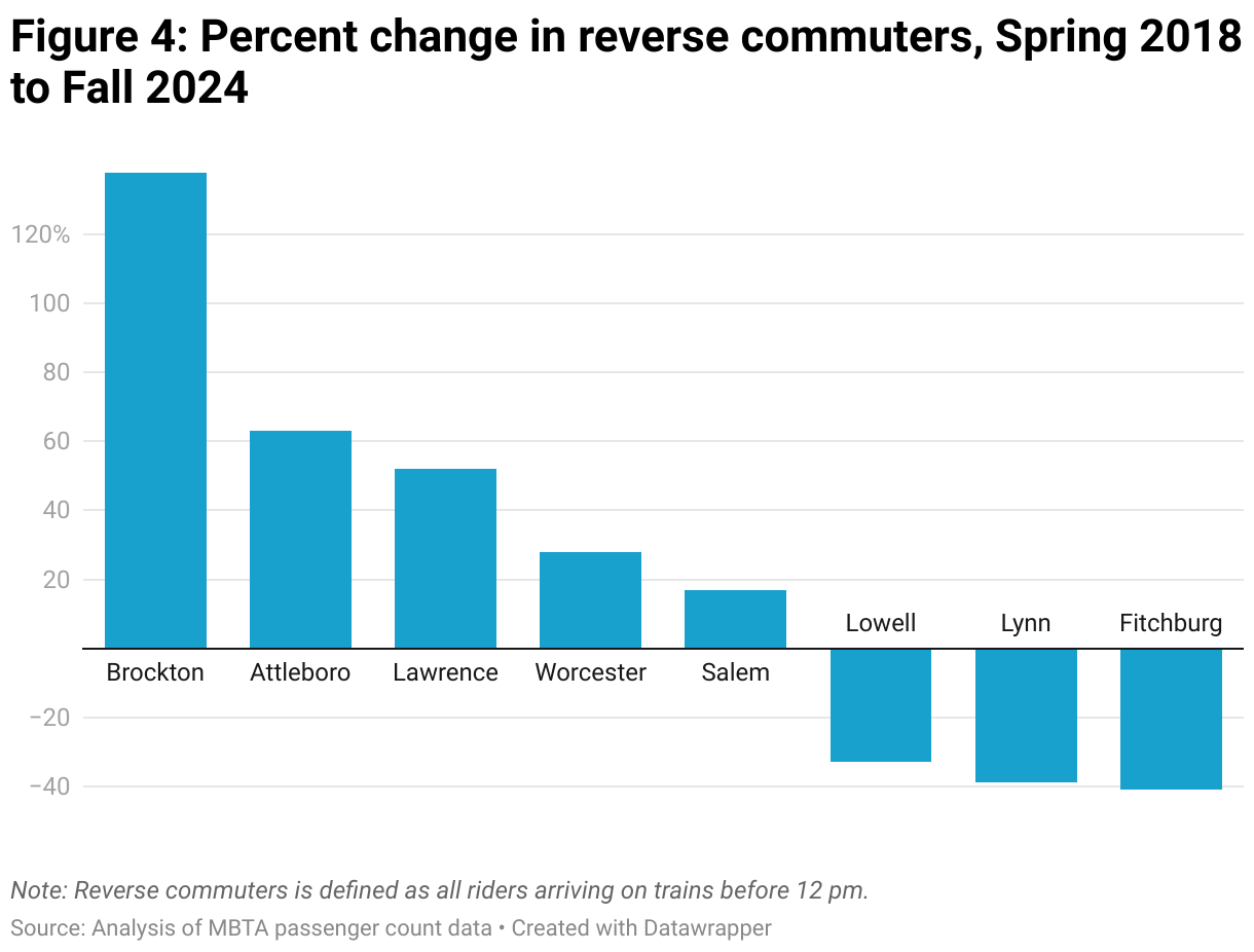 - The number of reverse commuters to Gateway Cities has increased significantly. On average, the number of riders reverse commuting to Gateway Cities grew by 23 percent between 2018 and 2024. Brockton saw the largest gain, with a 138-percent increase in riders arriving on AM trains from Boston. Attleboro also had a large increase (63 percent). Growth in reverse commuters in Lawrence (+52 percent) contrasts sharply with the station’s overall decline in ridership (-38 percent). However, this positive reverse commute trend was not universal. Three Gateway City stations saw significant declines in reverse commuters (Lowell, Lynn, and Fitchburg). But given the influence of line-specific services disruptions and random variability, especially with the relatively small number of reverse commuters, change at the city level should be interpreted cautiously (Figure 4).