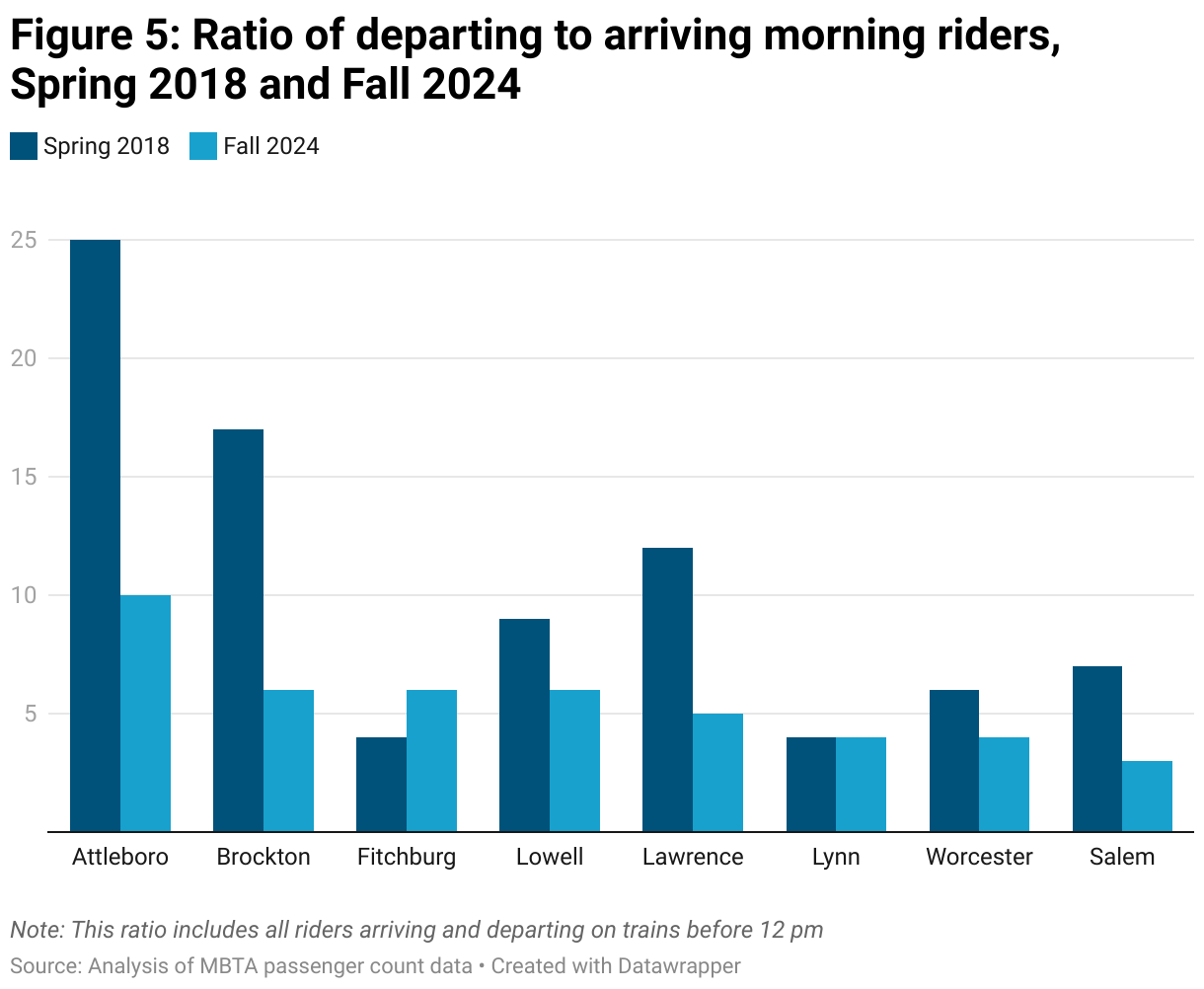 Assuming the bulk of reverse-commuting passengers are traveling for work, reductions in trips to Boston paired with an increasing number of reverse commuters has led to a somewhat more even exchange of labor between Boston and the Gateway Cities. On average, the ratio of AM riders leaving on trains to Boston to AM riders arriving on trains from Boston fell from 10 to 1 in 2018 to 5 to 1 in 2024. In Salem, there are now only 3 riders leaving for each one entering. Lynn and Worcester are also well below the 5- to-1 average. The shift from 17-to-1 to 6-to-1 in Brockton is especially notable given that the Brockton station did not see a sharp decline in departing riders over the period (Figure 5).
