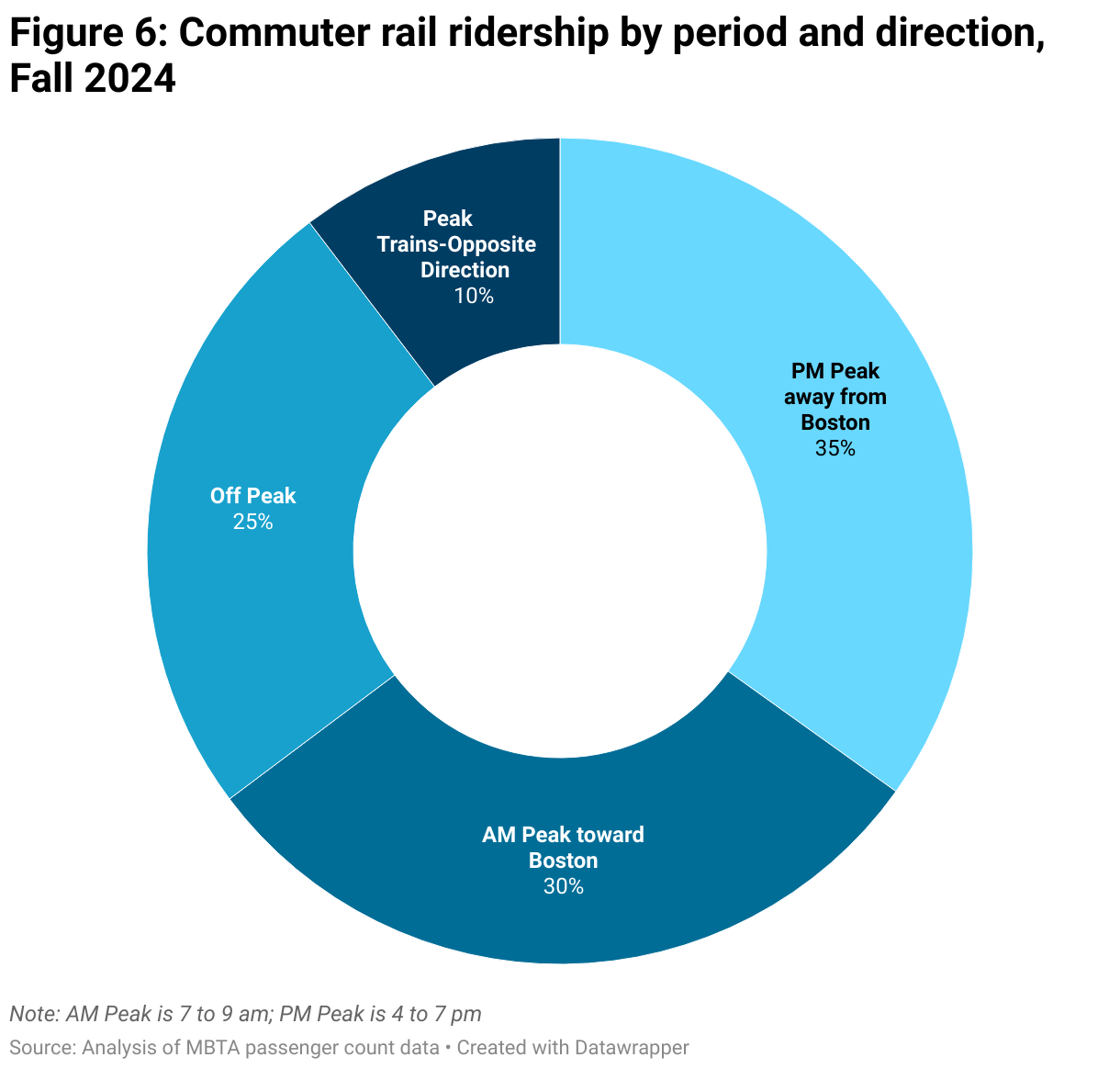 In the Fall of 2024, the MBTA commuter rail system operated 514 week-day train trips: 61 during the A.M. peak (7 to 9 a.m.) moving toward Boston, 76 during the P.M. peak (4 to 7 p.m.) moving away from Boston, 103 during the A.M. and P.M. peak travel periods moving in the opposite direction, and 274 moving in either direction during off-peak periods. Together, these trains moved just under 100,000 passengers, with about two-thirds of all riders moving during the peak period in the peak direction (Figure 6).