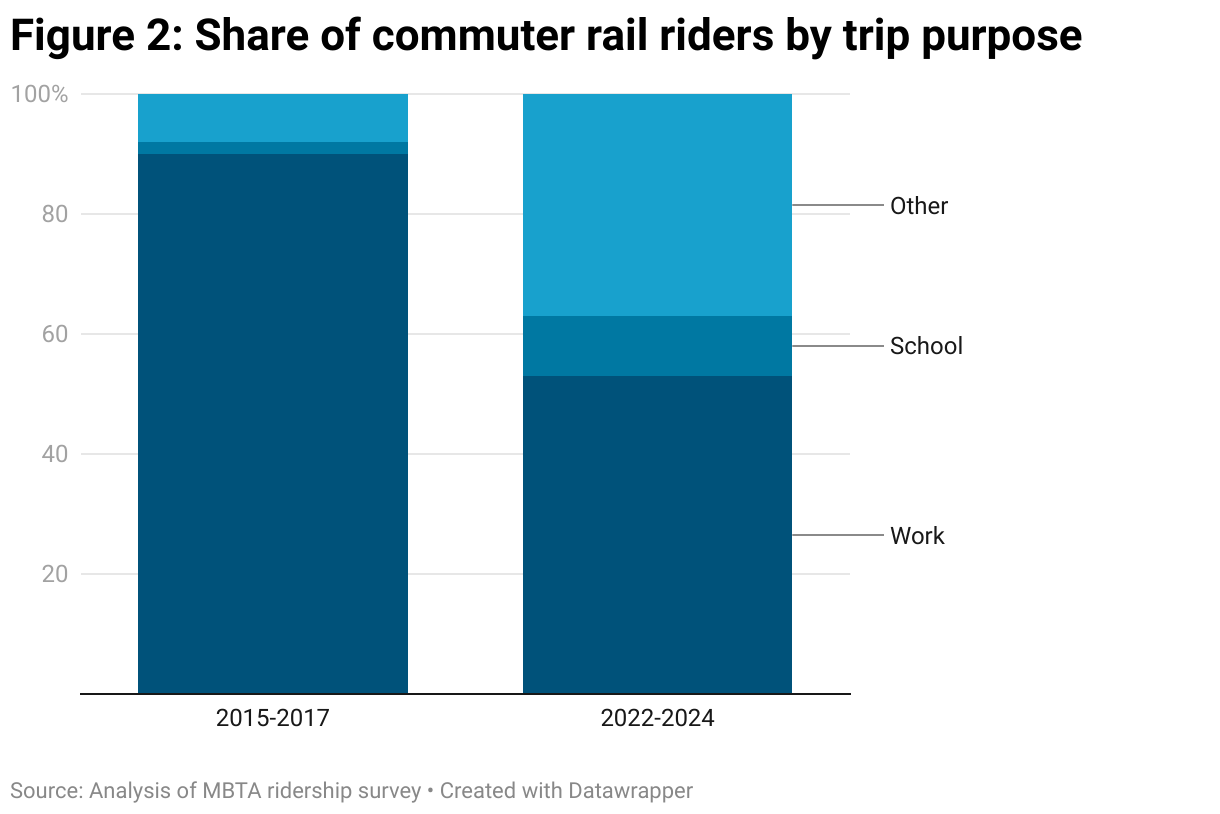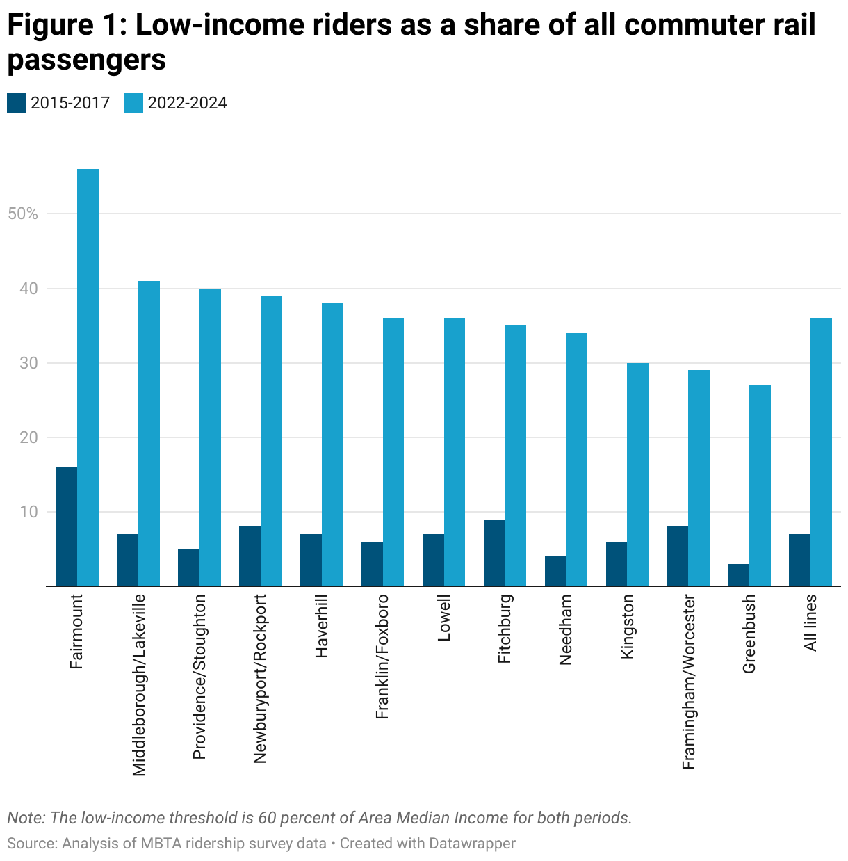 ↩︎ - For consistency between the two periods, 60 percent of AMI is the cutoff for low-income in these comparisons. In 2023, the MBTA increased the low-income threshold to 80 percent below of AMI. Therefore, more recent MBTA reports show 68 percent of commuter rail passengers are low-income (as opposed to 40 percent with the 60 percent AMI standard). ↩︎