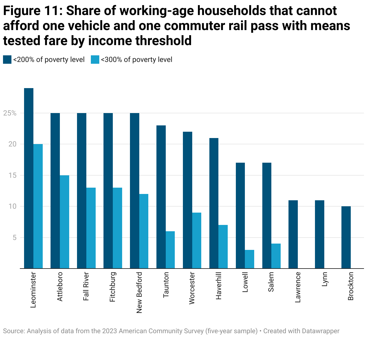 IERF lowers fares by half for residents with household income below 200 percent of the federal poverty level. For a family of four, this threshold is about $64,000 annually. The new discounted fare has significantly reduced the share of Gateway City households that cannot afford a monthly pass plus one vehicle. However, this modest transportation budget is still out of reach for more than one-quarter of residents in Attleboro, Fall River, Fitchburg, Leominster, and New Bedford. In eight Gateway Cities, a car and a monthly pass is unaffordable for over 20 percent of residents (Figure 11).