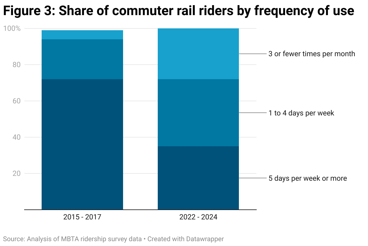 The large and growing share of riders walking and biking to the station suggests transit-oriented development is a key demand driver. This means the MBTA has a vital interest in ensuring that the land around each station is designed and developed in a manner that maximizes future ridership. As recent research by Boston Indicators and TransitMatters shows, there is considerable opportunity to generate a virtuous cycle with improved transit service fuels development, and, conversely, development at higher “transit-supportive densities” generates new ridership.6 - Early progress toward Regional Rail has increased mobility for those making non-work trips. Another striking difference in the post-pandemic, post-schedule change period is the increase in the number of riders traveling for reasons other than employment (Figure 2). Commuters making their way to work made up 90 percent of all riders on the 2015 to 2017 surveys. In comparison, only about half (53 percent) of passengers surveyed in the 2022 to 2024 period were on their way to work.7 This change is also apparent in frequency data. The share of riders traveling 5 days per week or more declined by 37 percentage points. There was a significant increase in those traveling 1 to 4 days per week (+15 percentage points), reflecting the shift to hybrid work schedules. But the biggest change was among those using commuter rail three or fewer times per month (+23 percentage points). These passengers now make up more than one-quarter of riders (Figure 3).